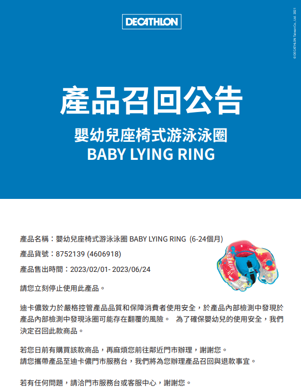 產品召回-嬰幼兒座椅式游泳泳圈(6-24 個月)